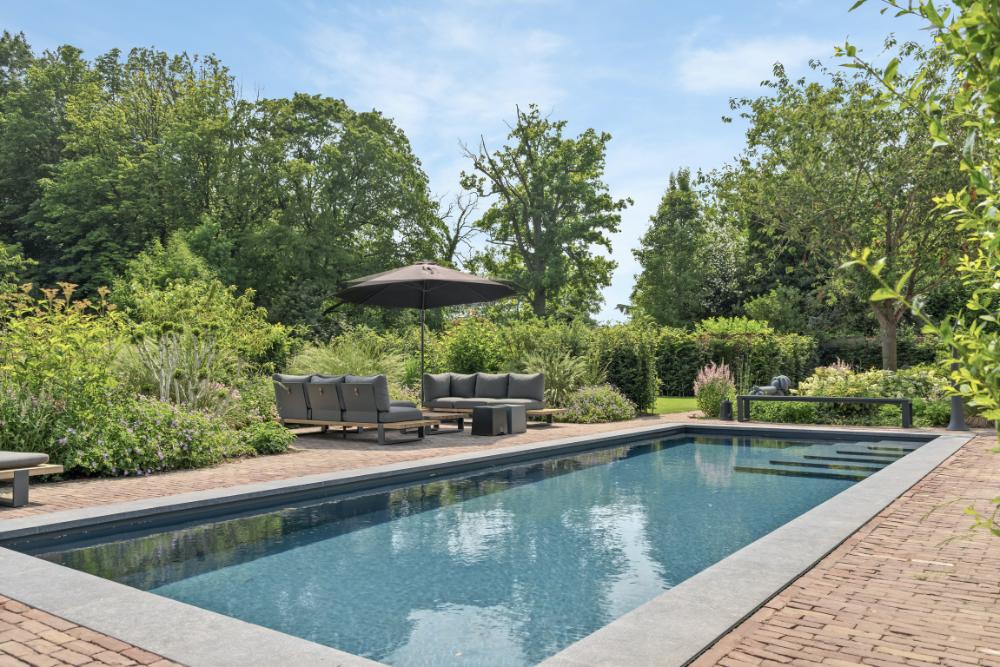 In de historische omgeving langs de Vecht kreeg Jorine Boogaard de opdracht om het tuindeel dicht tegen een monumentale woonboerderij opnieuw in te vullen. Ze koos voor een langwerpig zwembad passend in de belijning van het landschap. “Door te spelen met hoogte is er voldoende privacy terwijl er via allerlei doorkijkjes steeds zicht is op de rest van de tuin én de landelijke omgeving.